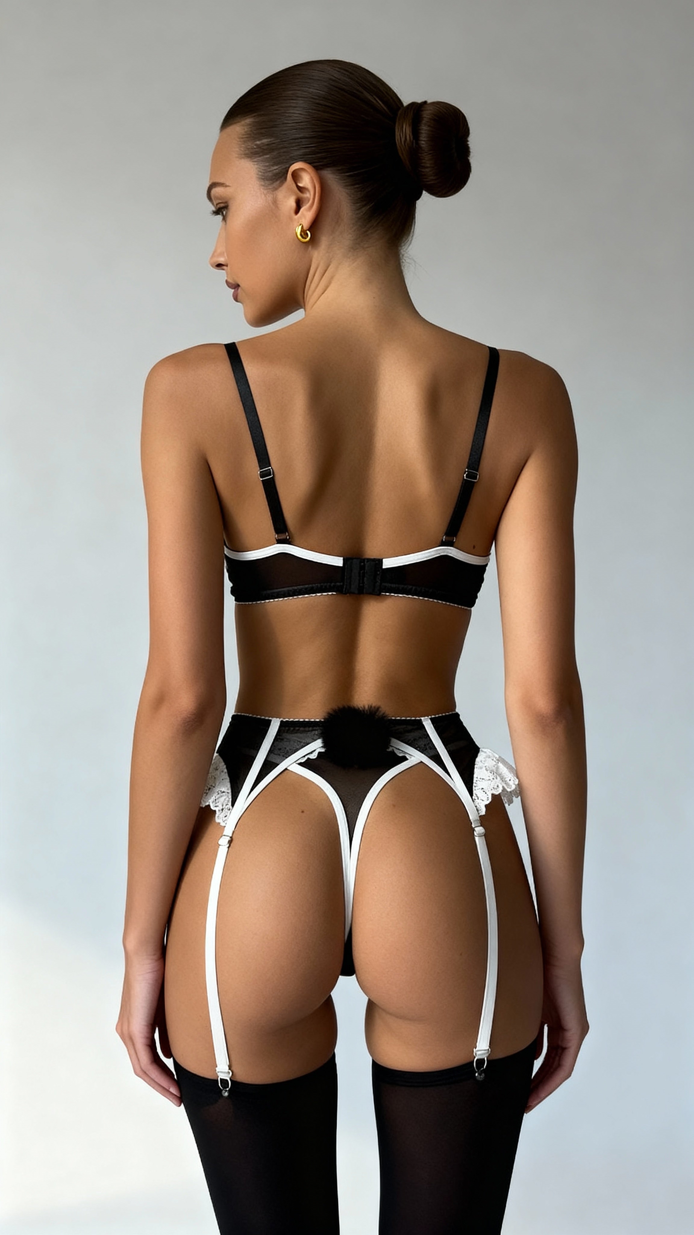 Composé d’un soutien-gorge à armatures, d’un porte-jarretelles et d’une culotte assortie, il allie tulle transparent et dentelle florale pour une silhouette à la fois douce et sensuelle.